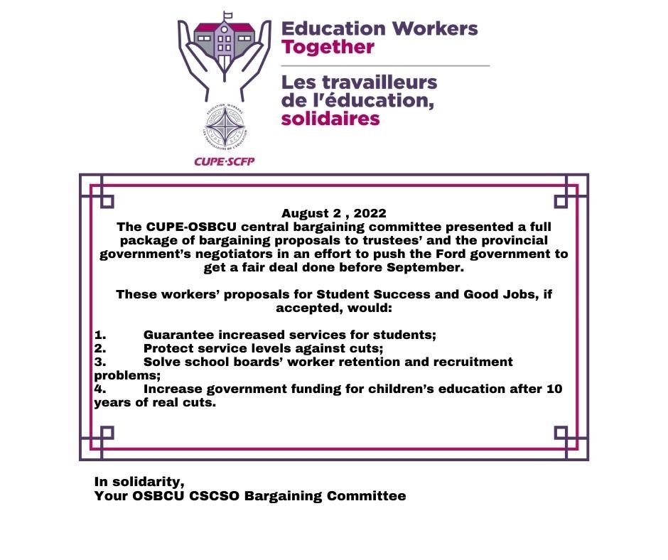 The package of Proposals for Student Success and Good Jobs reflects your and your coworkers priorities as expressed in the CUPE-OSBCU bargaining survey that had 11,000 respondents in March 2021. You can access the full package on the OSBCU website