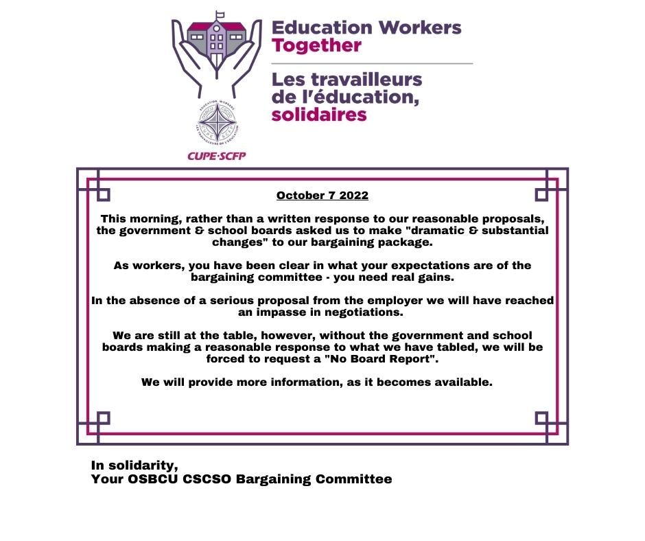 We are still at the table, however, without the government and school boards making a reasonable response to what we have tabled, we will be forced to request a “No Board Report”.